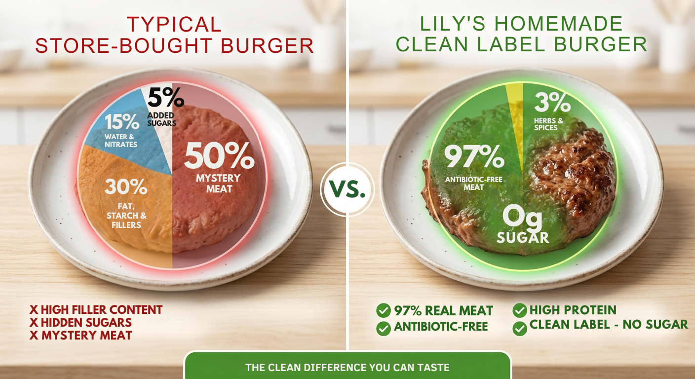 We put our ingredients side-by-side with the 'other guys' because we have nothing to hide. See why Lily’s Homemade is the gold standard for clean, delicious burgers.